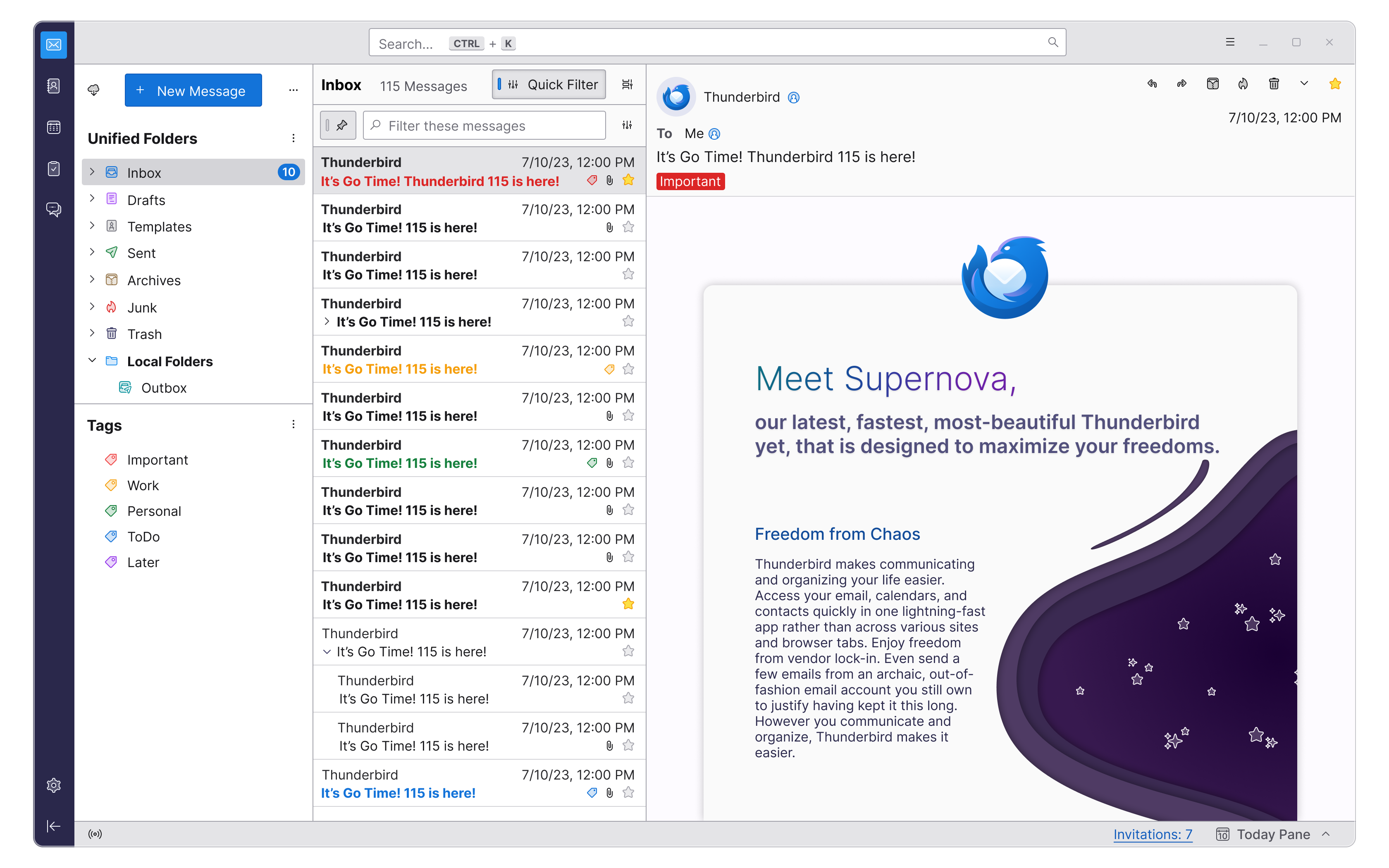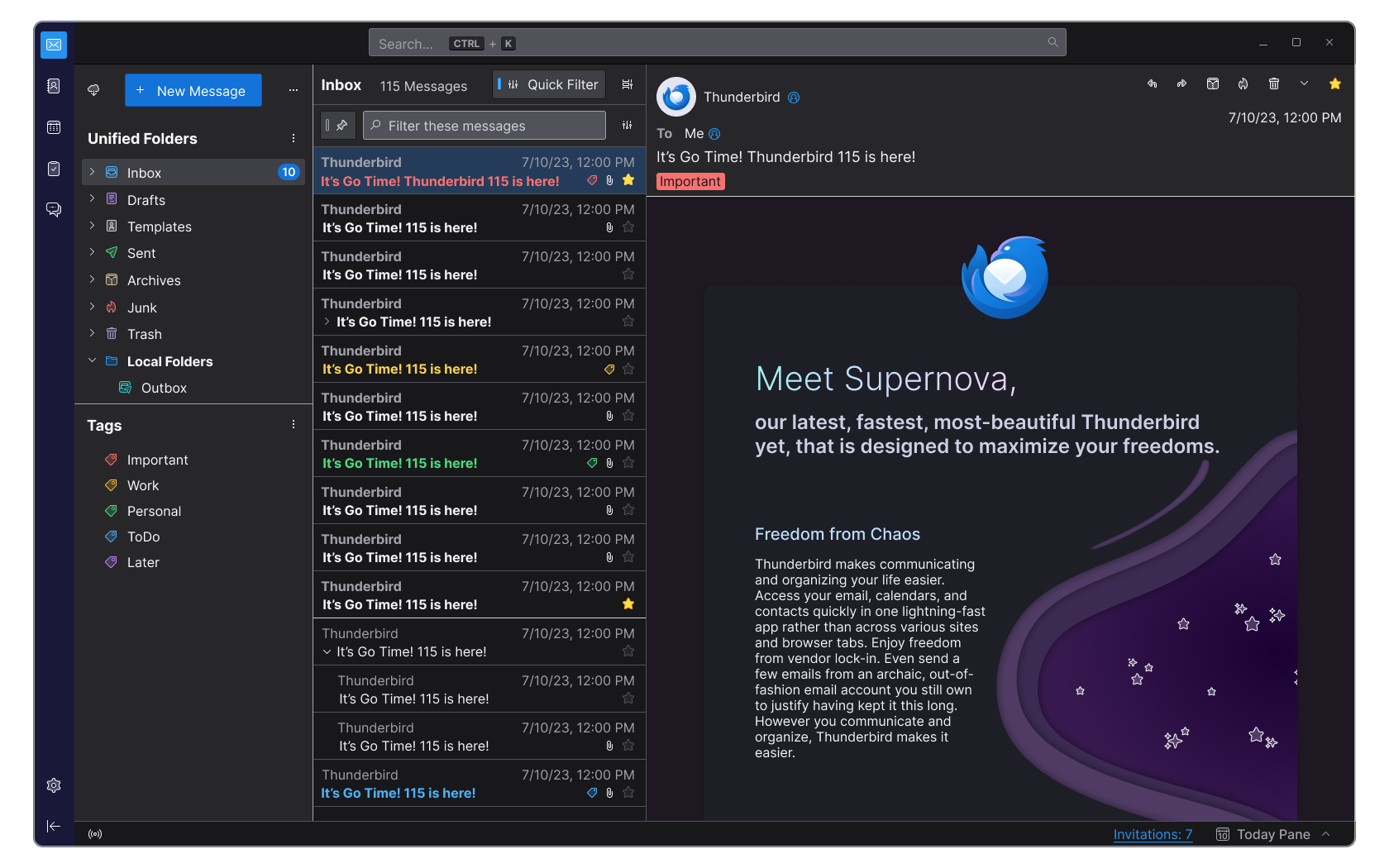 Thunderbird 115 "Supernova" launches on Monday, July 10th! It's our first step towards a more modern, more beautiful, and more customizable Thunderbird experience.
